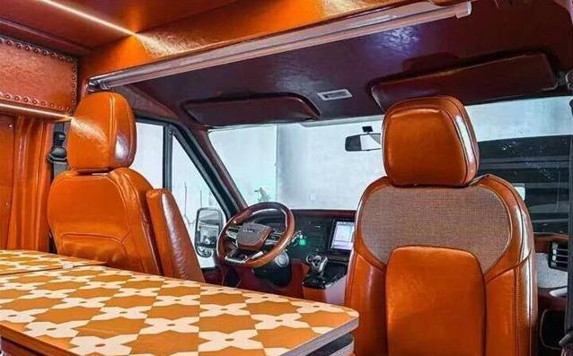 走进车内,复古风格贯穿始终,座椅和门板裹着油蜡皮,手感柔和耐用,美式印花地板配上麂皮顶棚,空间里弥漫着温暖怀旧的气息。储物布局用心,顶部吊柜、左侧高柜加上右侧多功能收纳盒,把行李工具分门别类摆放,整洁感油然而生。会客区域中排三人座椅搭配可折叠桌板,桌板平时藏在侧柜,需要时拉出就能和副驾旋转座椅对坐,围坐吃饭聊天办公都合适。后排沙发床展开即成双人床铺,双层隔音保温材料加上十二伏分体变频空调和高原柴油暖风机,夜晚休息时温度稳定安静,睡眠质量容易得到保障。