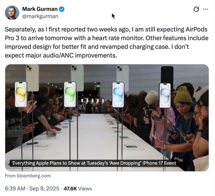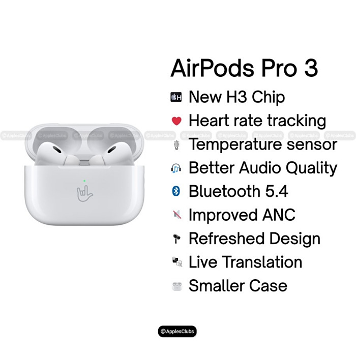 除了全新的 iPhone 17 系列和 Apple Watch,新款 AirPods Pro 3 也将成为本场发布会的重要亮点。据 彭博社的Mark Gurman爆料消息称,AirPods Pro 3 将搭载最新的 H3 芯片,但在主动降噪和音质方面的升级幅度并不显著,苹果此次的重点转向健康功能的拓展。