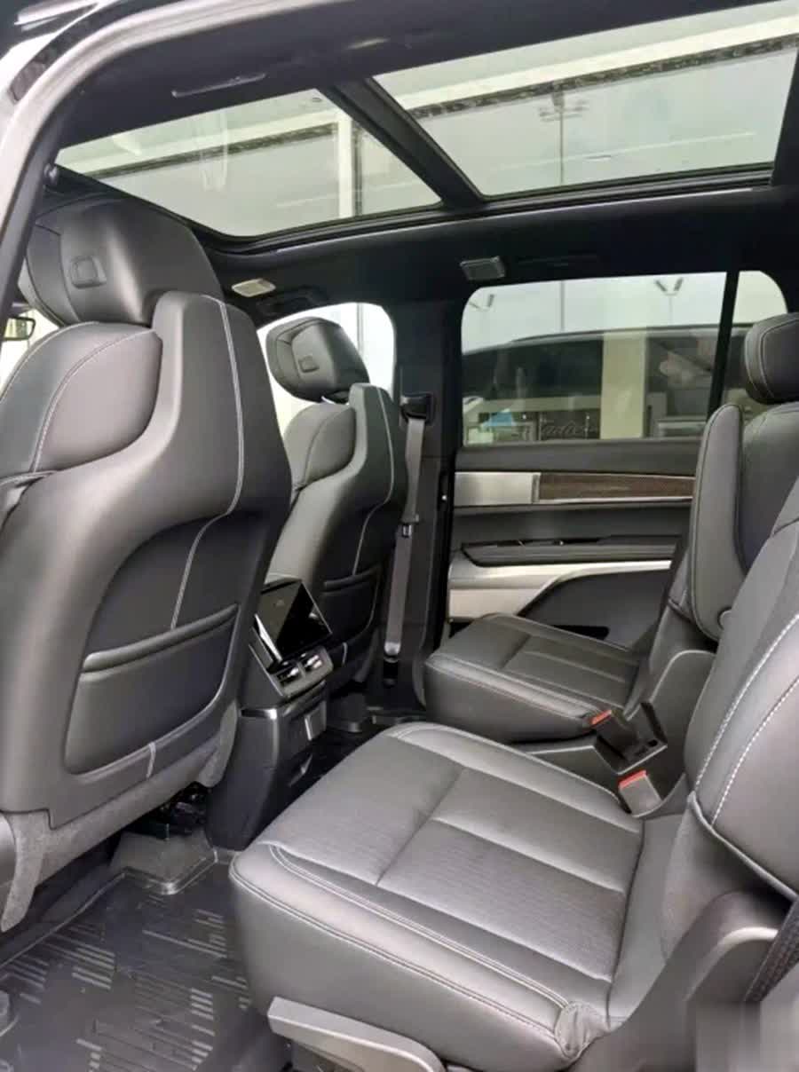 车身侧面,其魁梧、修长的身形结构,依然能让人一眼看出其美系SUV固有的力量感。而个性化的悬浮式车顶样式,搭配隐藏式门把手以及内置有红色刹车卡钳的熏黑多幅式轮毂等设计细节,不仅不会显得笨重,还能将年轻、运动气息清晰显露。