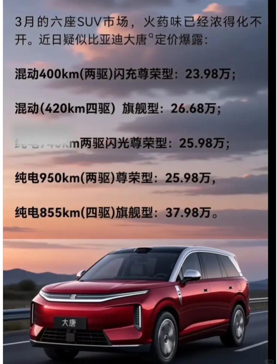 在国内新能源中高端 SUV 市场持续升温的背景下,大唐系列凭借大空间、强动力、高配置等优势,一直是家庭用户与品质出行消费者重点关注的车型。近期,大唐纯电四驱版的市场定价成为行业热议焦点,其中 “纯电四驱 25 万” 的预期价位,更是引发了消费者对车型性价比、产品竞争力与购买价值的广泛讨论。对于关注这款车型的用户而言,判断这一定价是否靠谱,需要结合产品定位、市场环境、配置水平与长期用车成本综合分析。